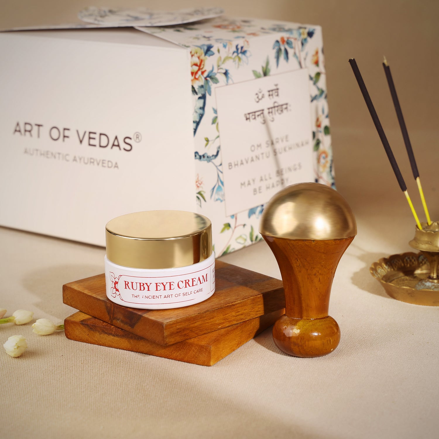 Le kit de soins des yeux Kumkumadi comprend : Crème contour des yeux Ruby (15 ml) : un mélange luxueux de safran et d'herbes ayurvédiques, conçu pour hydrater, éclaircir et réduire les poches, les cernes et les ridules. Mini <tc>Kansa</tc> Baguette : Un outil ayurvédique de précision, conçu pour une stimulation douce des points marma, améliorant la circulation, réduisant la tension et améliorant l'absorption du produit.